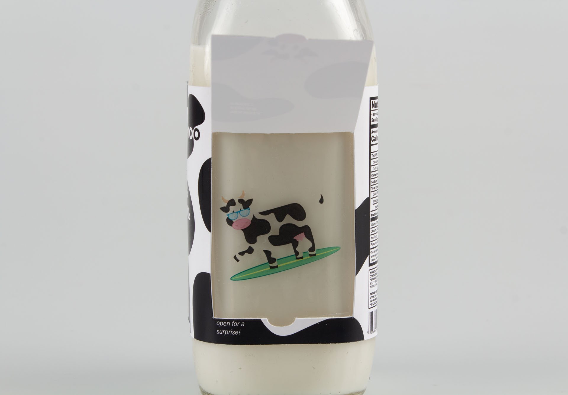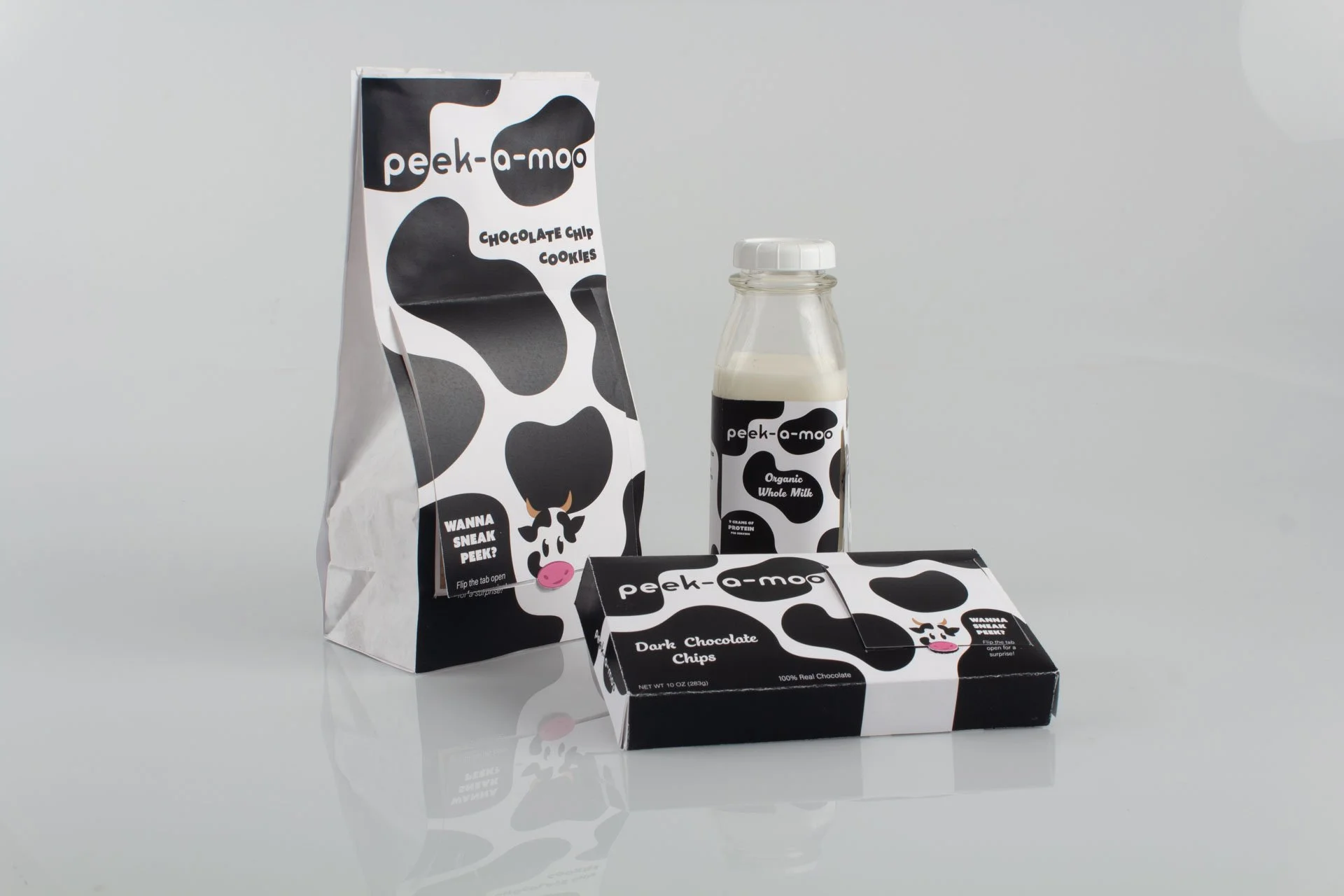 Peek-a-moo packaging is designed with the user in mind. The peek-a-boo tab optimizes user engagement, giving consumers a way to easily view the product, as well as catching the attention of children with the hidden graphic. This decorative function creates an interaction between the consumer and the product.
